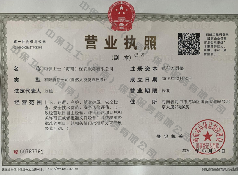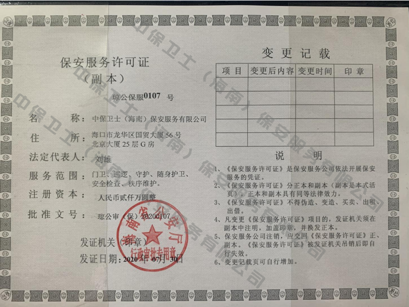 哈尔滨义云租赁与管理服务有限公司是经海南省公安厅批准,依法持有《保安服务许可证》,提供保安服务、门卫、巡逻、守护、区域秩序维护、随身护卫、安全检查的专业化保安服务公司。